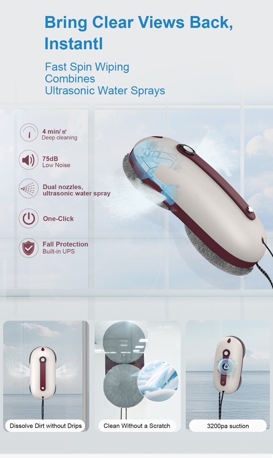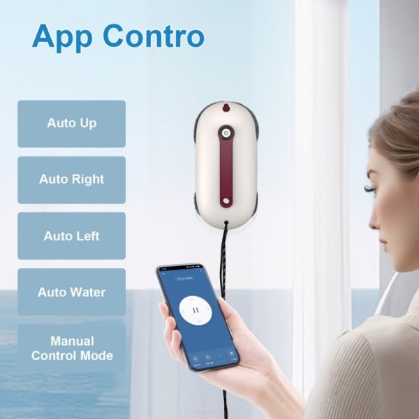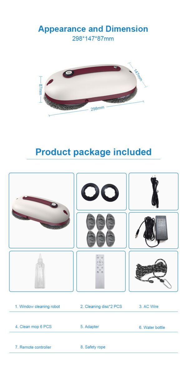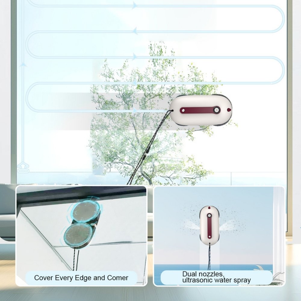 Imitation hand-wipe window cleaning robot with intelligent path planning, dual ultrasonic water spray, and built-in fall protection for safe and effortless glass cleaning.